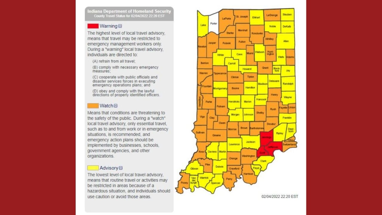 Weather Advisory Map Indiana – Overnight snow prompted some central Indiana counties to issue travel advisories on Friday. Weather-related closings and delays Bartholomew, Hancock, Henry and Monroe counties were among . Single-digit temperatures, combined with snow overnight, made travel hazardous in parts of Indiana. In Marion County, for example, Indiana State Police said troopers with the Indianapolis District had .